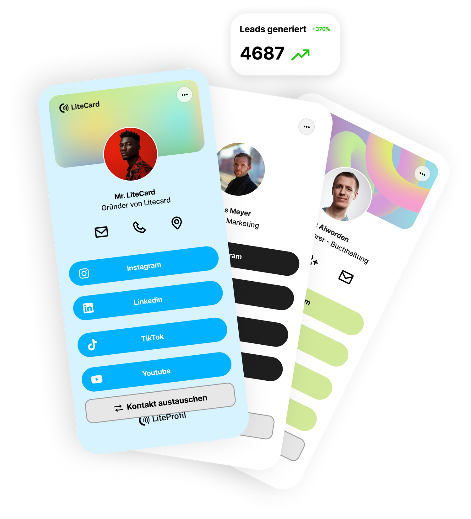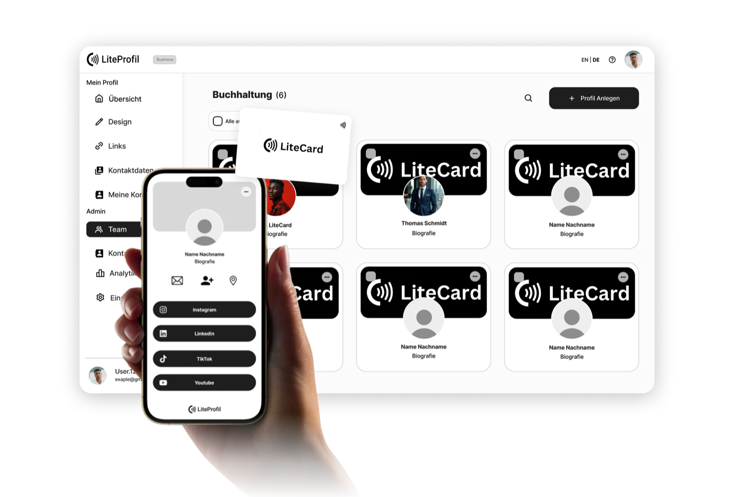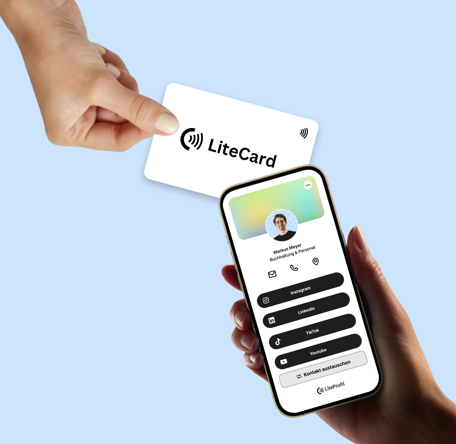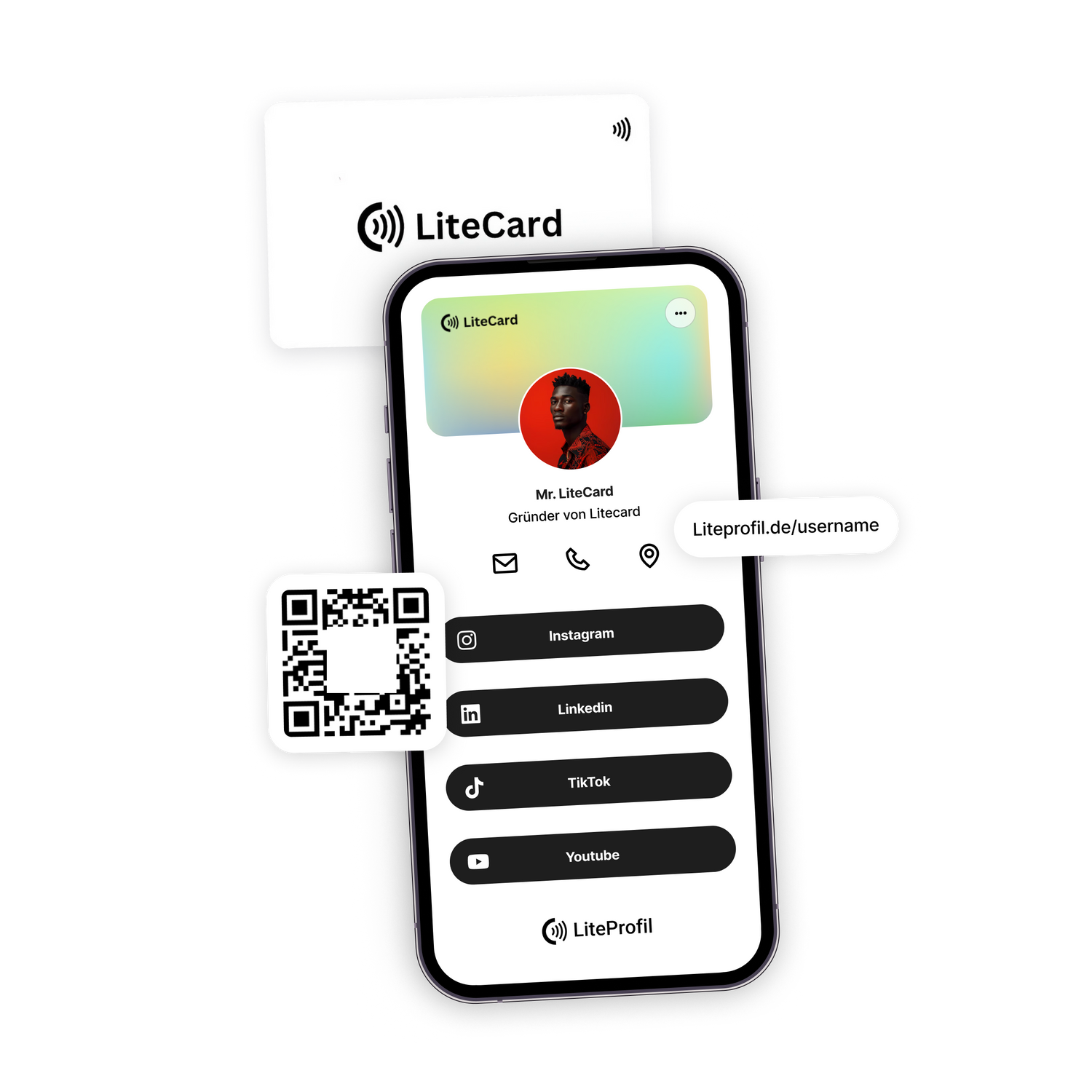 Die LiteCard ist eine digitale Visitenkarte, die es Ihnen ermöglicht, Ihre Kontaktdaten und Links über einen einfachen Scan oder Tap zu teilen. Sie aktualisiert Informationen in Echtzeit und erleichtert das Netzwerken enorm.