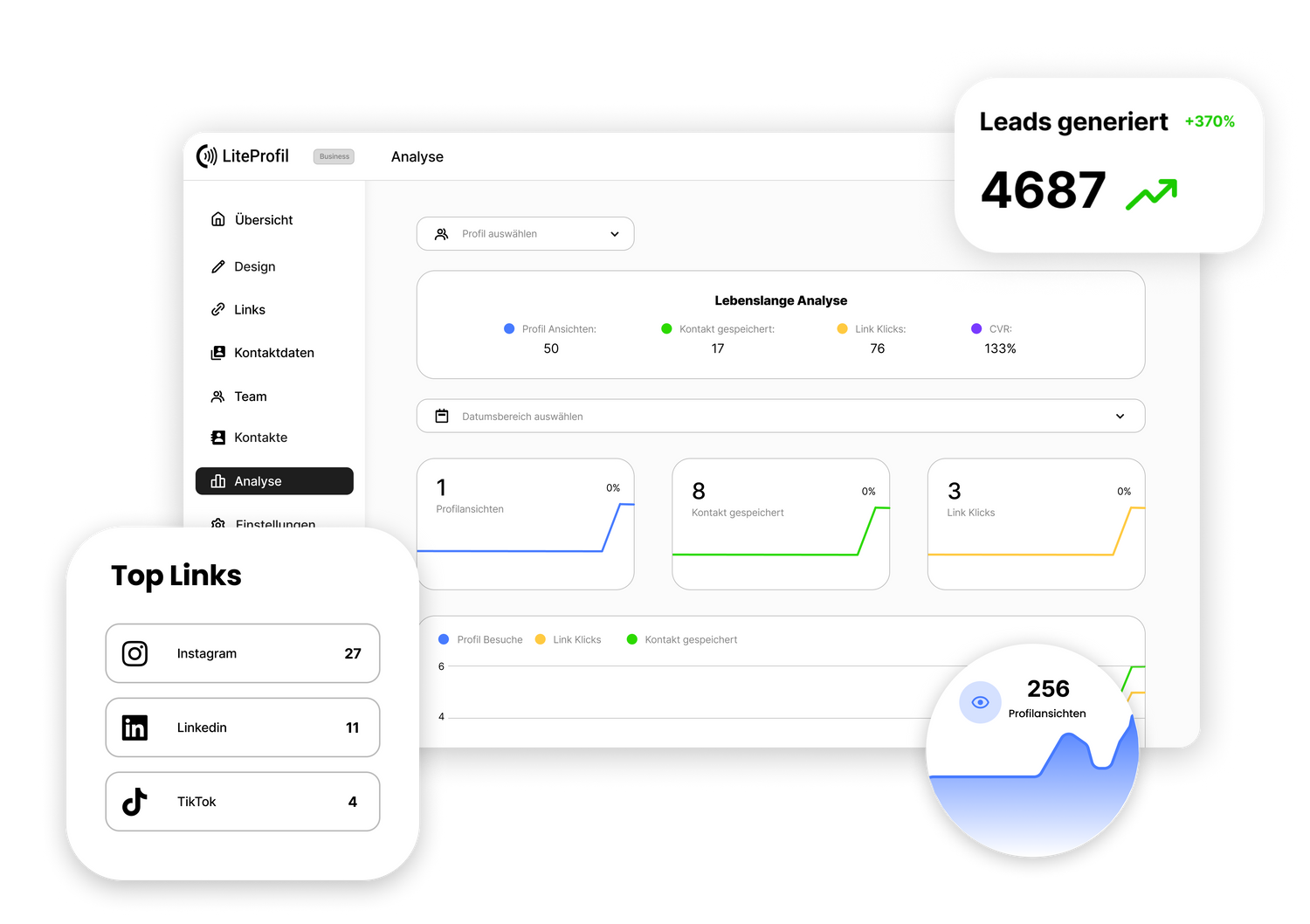 Überwachen Sie Profilansichten, gespeicherte Kontakte und Link-Klicks in Echtzeit. Sehen Sie Ihre Top-Links und generierten Leads auf einen Blick.