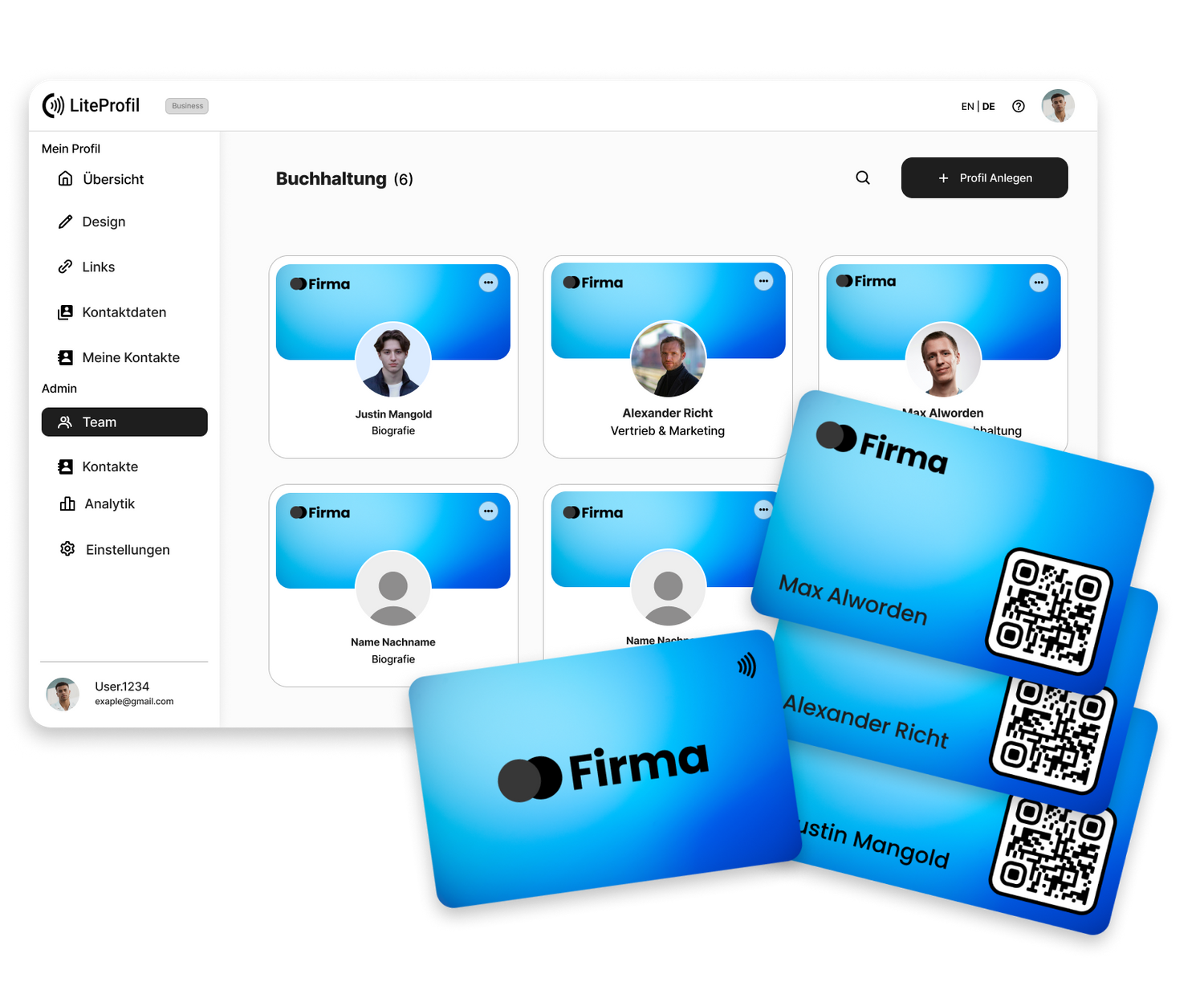 Mit LiteProfil verwalten Sie Ihre digitalen Visitenkarten und Teamprofile zentral an einem Ort. Behalten Sie den Überblick, bearbeiten Sie Daten einfach und bieten Sie Ihren Kunden ein professionelles Erlebnis – alles auf einer benutzerfreundlichen Plattform.